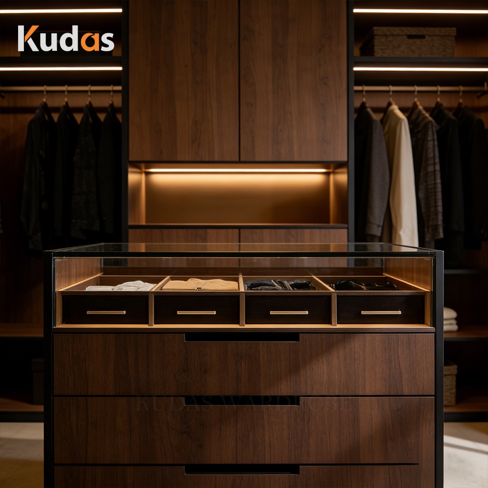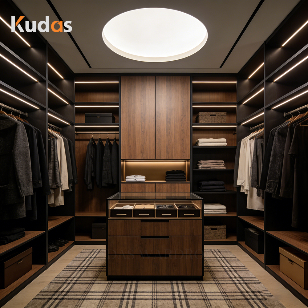 Kudas Luxury Modern Walk-in Closet - Walnut Wood Grain with Built-in LED Lighting & Central Storage Island Organized Wardrobe